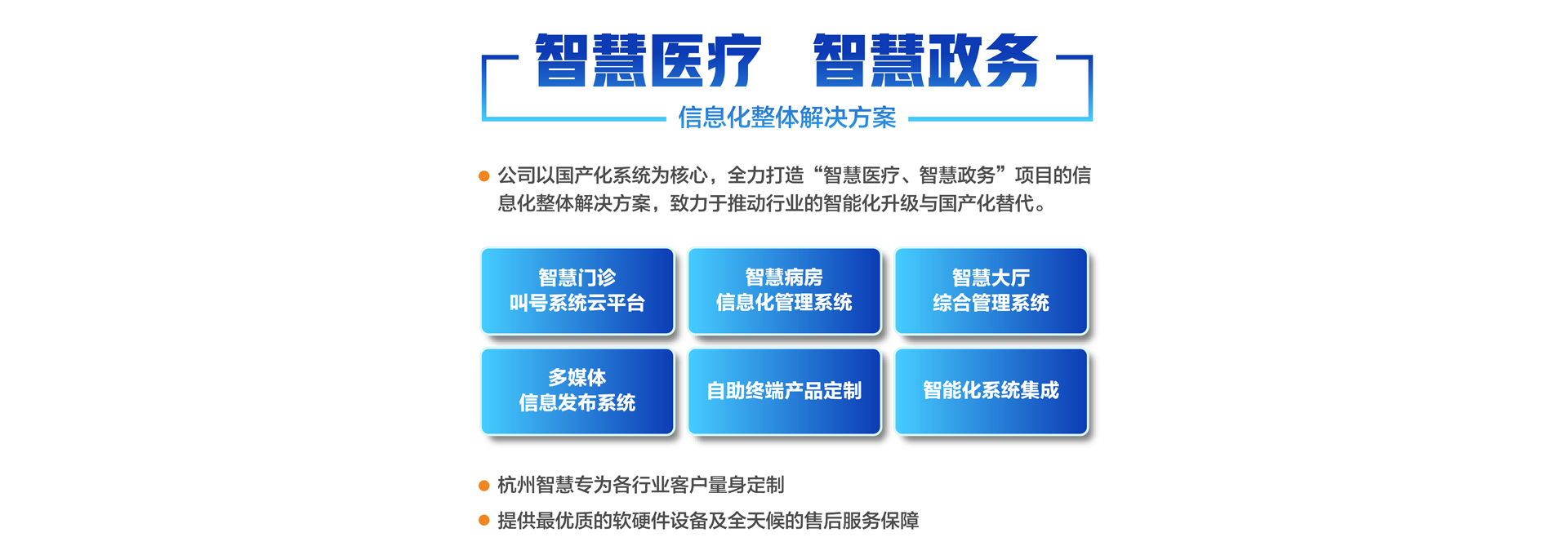 杭州智慧科技有限公司初創(chuàng)于2003年,總部位于重要的電子商務(wù)中心中國(guó)杭州公司主營(yíng)業(yè)務(wù)有:智慧分診叫號(hào)系統(tǒng)、智慧病房醫(yī)護(hù)對(duì)講系統(tǒng)、智慧大廳綜合管理系統(tǒng)、智慧政務(wù)管理系統(tǒng)、智慧多媒體信息發(fā)布系統(tǒng)、導(dǎo)診系統(tǒng)及各自助終端產(chǎn)品定制。專(zhuān)為各行業(yè)客戶(hù)量身定制。公司已有20余年行業(yè)經(jīng)驗(yàn)沉淀積累,擁有優(yōu)秀的產(chǎn)品外觀設(shè)計(jì)師和各類(lèi)中高級(jí)專(zhuān)業(yè)技術(shù)工程師,確保所研發(fā)的產(chǎn)品具有行業(yè)領(lǐng)先的外觀及可靠的技術(shù)性能。并擁有權(quán)威部門(mén)頒發(fā)的各類(lèi)知識(shí)產(chǎn)權(quán)及專(zhuān)利證書(shū),30多項(xiàng)資質(zhì)證書(shū)、800多個(gè)合作伙伴、2000多個(gè)項(xiàng)目成功案例經(jīng)驗(yàn)。 智慧產(chǎn)品已遍及全國(guó)各醫(yī)療、政務(wù)、金融、通訊、公安、工商、稅務(wù)等行業(yè),形成以“立足杭州、輻射長(zhǎng)三角、拓展全國(guó)”的戰(zhàn)略發(fā)展格局,產(chǎn)品經(jīng)過(guò)歷年不斷創(chuàng)新,形成專(zhuān)業(yè)化、平臺(tái)化,致力于成為智慧產(chǎn)品的領(lǐng)軍企業(yè)。 公司建立了完善的技術(shù)培訓(xùn)及售后服務(wù)中心,并設(shè)24小時(shí)熱線咨詢(xún)電話(huà)解答用戶(hù)反饋的問(wèn)題。同時(shí)應(yīng)客戶(hù)要求定期派技術(shù)人員到 全國(guó)各地進(jìn)行技術(shù)指導(dǎo)輔助用戶(hù)正確使用智慧產(chǎn)品并能獨(dú)立安裝、調(diào)試、日常維護(hù)等工作。提供最優(yōu)質(zhì)的設(shè)備及全天候的售后服務(wù)保障,智慧永恒不變的服務(wù)宗旨——致力于客戶(hù)的滿(mǎn)意與成功!...